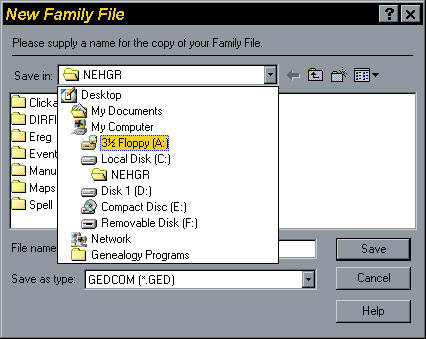 Under "Save as type:" select GEDCOM (*GED). The program will automatically enter a file name in the in the "File name:" field (e.g. SMITH.GED). You can change the file name if you wish. Click the arrow to the right of the "Save in" field and select the directory where you want to save you file. For example, if you want to put it on a diskette, you might select "3-1/2 Floppy [A:]." Remember the name of the directory where you saved you file so you can find it again! Now Click the Save button.