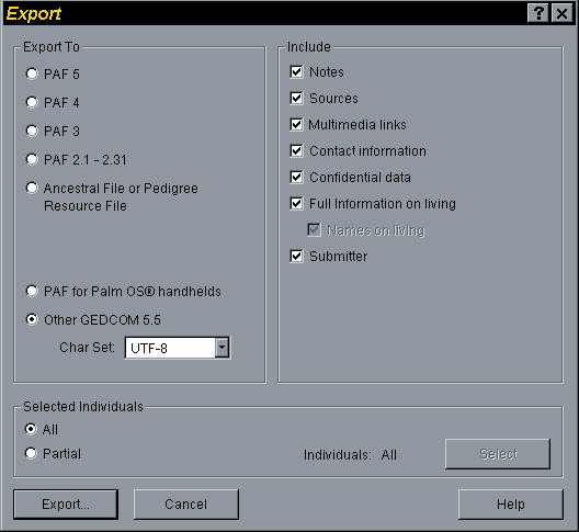 This GEDCOM export window will appear: