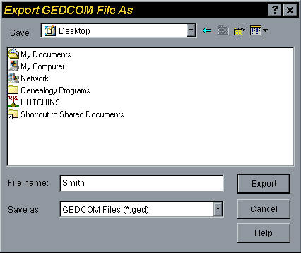 Start at the bottom. In the "Save as" field, make sure it says "GEDCOM files (*.ged). Type a name for your file in the "File name" field (e.g. Smith). Click the arrow to the right of the Save field and choose the directory where you want your file to be saved. Be sure to remember where you put your file! Now Click Export